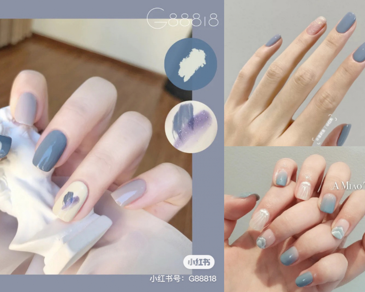 若喜歡溫暖感重一些的,霧面絕對是首選!磨砂般的柔霧手感搭上雲朵藍,讓色澤中的灰調更高調一些,搭上霧面裸白色或是加點格紋、花朵圖騰點綴,更能讓甲面帶點文青感!喜歡簡約一點的女孩,也可以試試以漸層跳色的方式搭配,簡單不失莊重,男友也看得懂呢~