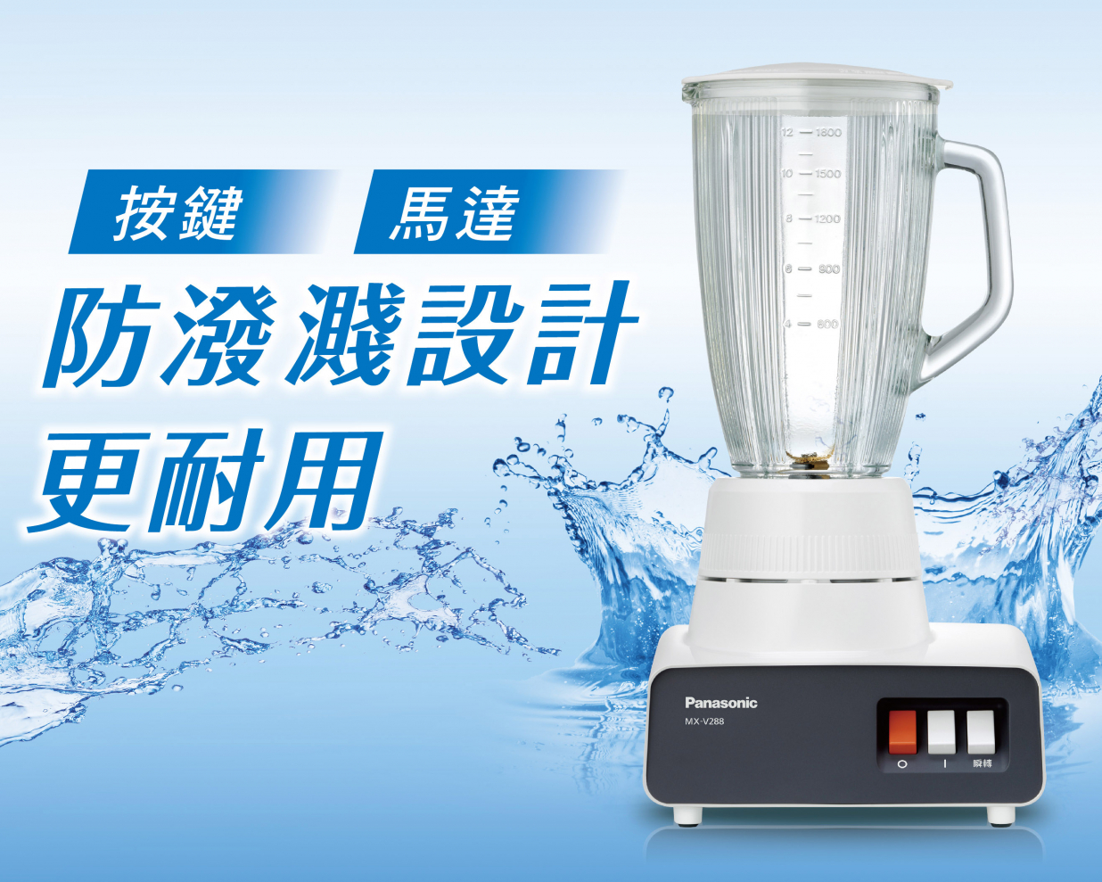 此款果汁機搭配96%切削率的鋸齒鍍鈦鋼刀,不管喜好哪種水果,都能打得細緻綿密,就連冰沙也均勻又順口。另外,果汁機的按鍵、馬達具防潑濺設計,機台防水係數達IPX3不怕潑濺,使用更安心。其中,還搭載媲美商用等級馬達,可連續運轉100小時以上,耐用性十足!除了廣獲果汁店家喜愛的大容量果汁機,Panasonic還有合乎小家庭需求的經典果汁機(MX-EX1551、MX-EX1001),以及適合單身貴族的隨行杯果汁機(MX-XPT102)供選擇,趕快趁夏天購入專屬你的果汁機吧!