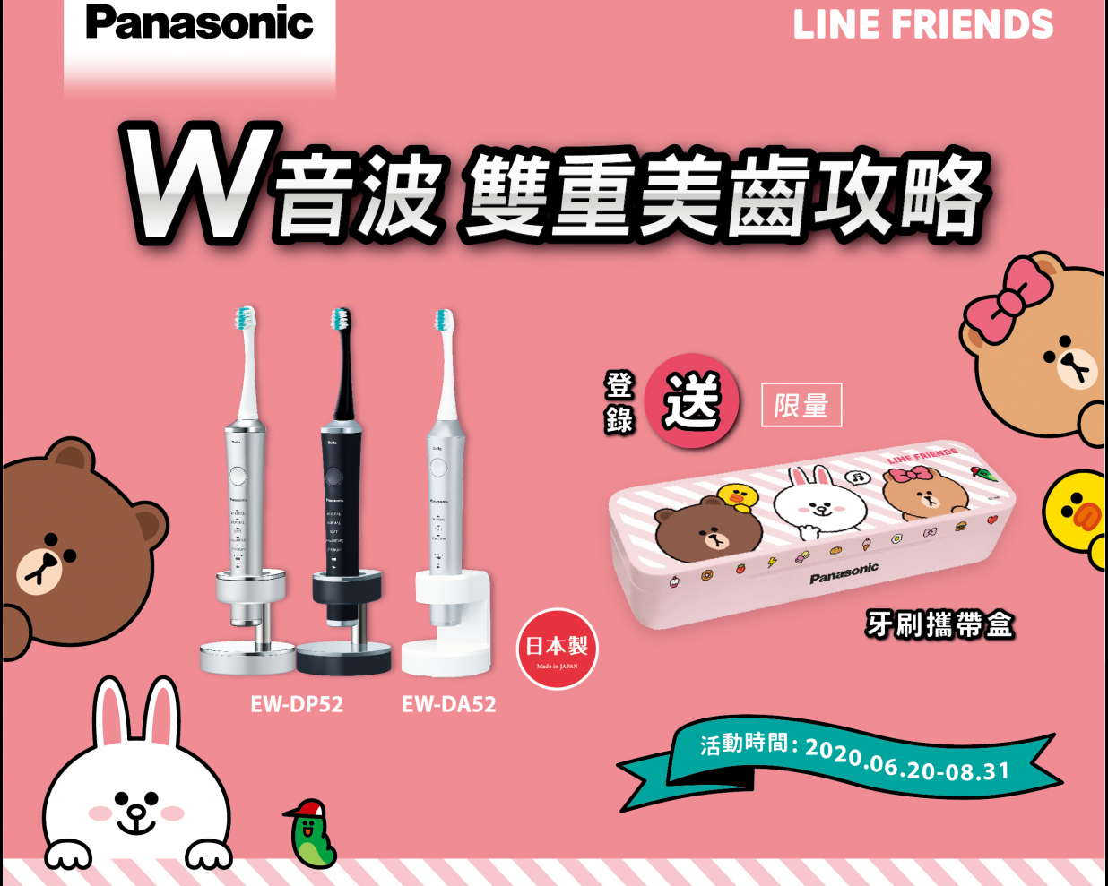 即日起至2020/08/31止,購買日本製音波電動牙刷指定型號,回函送沖牙機EW-1211,會員登錄再送限量LINE牙刷攜帶盒!數量有限,送完為止。